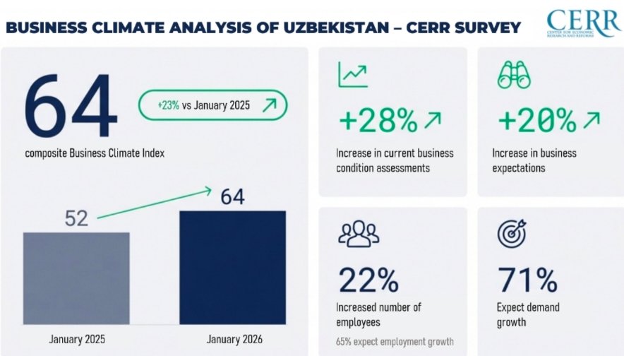 In January of the current year, Uzbekistan’s composite Business Climate Index stood at 64 points (on a scale from −100 to +100), which is 23% higher than the level of 2025.