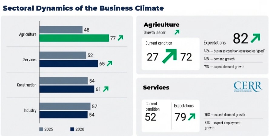 In agriculture, the Business Climate Index increased by 62% year-on-year and reached 77 points, compared to 48 points in January 2025.Growth was mainly supported by a significant improvement in assessments of current conditions and more favorable expectations.