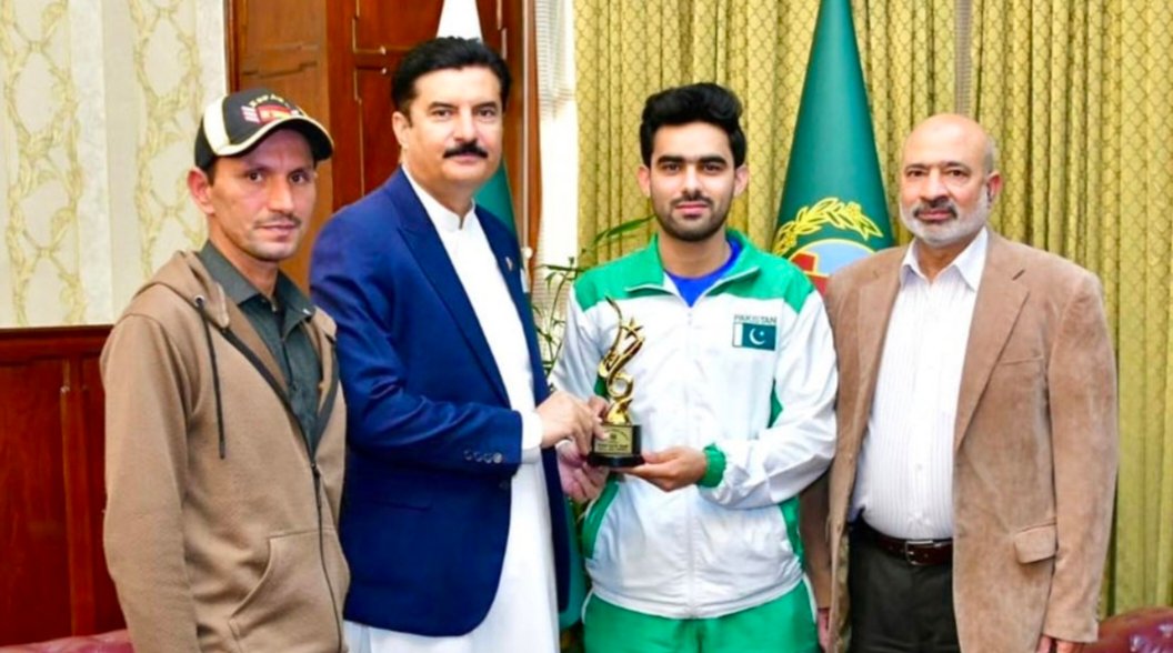PESHAWAR (IN) Governor Khyber Pakhtunkhwa Faisal Karim Kundi on Thursday presented an award to international squash player Khushhal Riaz Khan in recognition of his outstanding performances at national and international levels.The awards were announced in November to acknowledge athletes from across the province who excelled in various sports. However, Khushhal was unable to attend the ceremony at that time as he was participating in a training camp in preparation for the National Games.